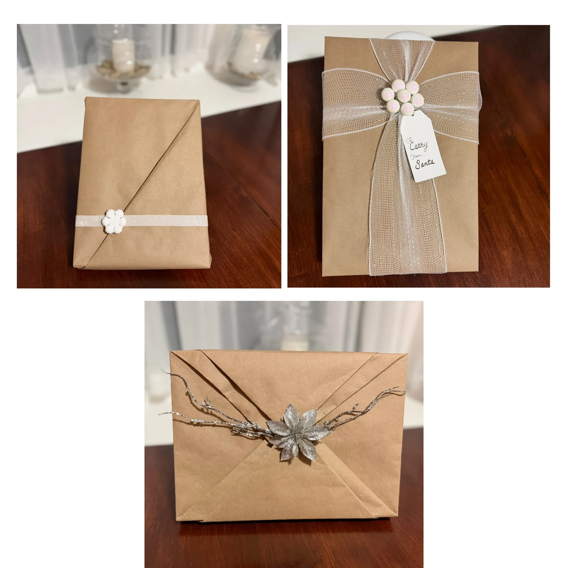 Each package is presented with standard paper and completed with a coordinating tag and simple tasteful bow.